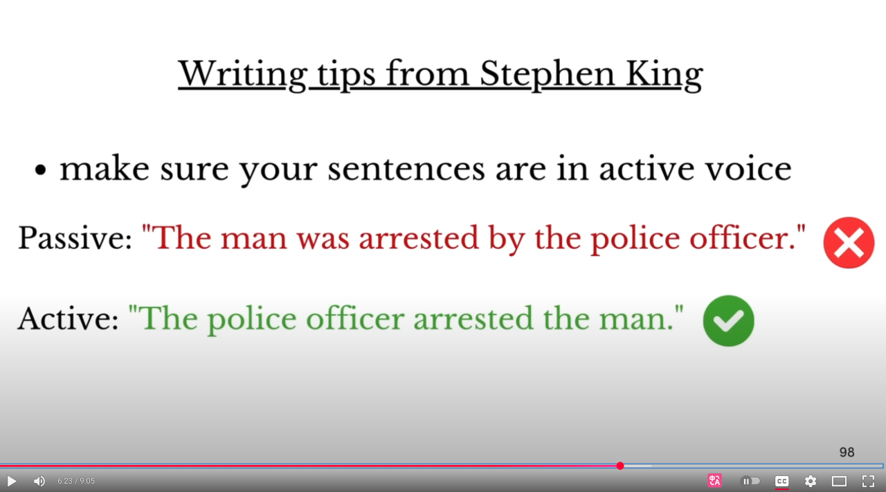 在第二稿里,金会确保句子尽量用主动语态。例如:被动语态是“那名男子被警察逮捕”,主动语态是“警察逮捕了那名男子”。主动语态让主语在行动,带来紧迫感,让读者更贴近角色的体验。他也会尽量去掉副词,用更强有力的动词替换。与其写“他用力关上门”,不如写“他甩上了门”。描述方面,金认为:描述应当从作者的想象开始,但应当在读者的脑海里完成。因此描述要克制,给读者留白。
